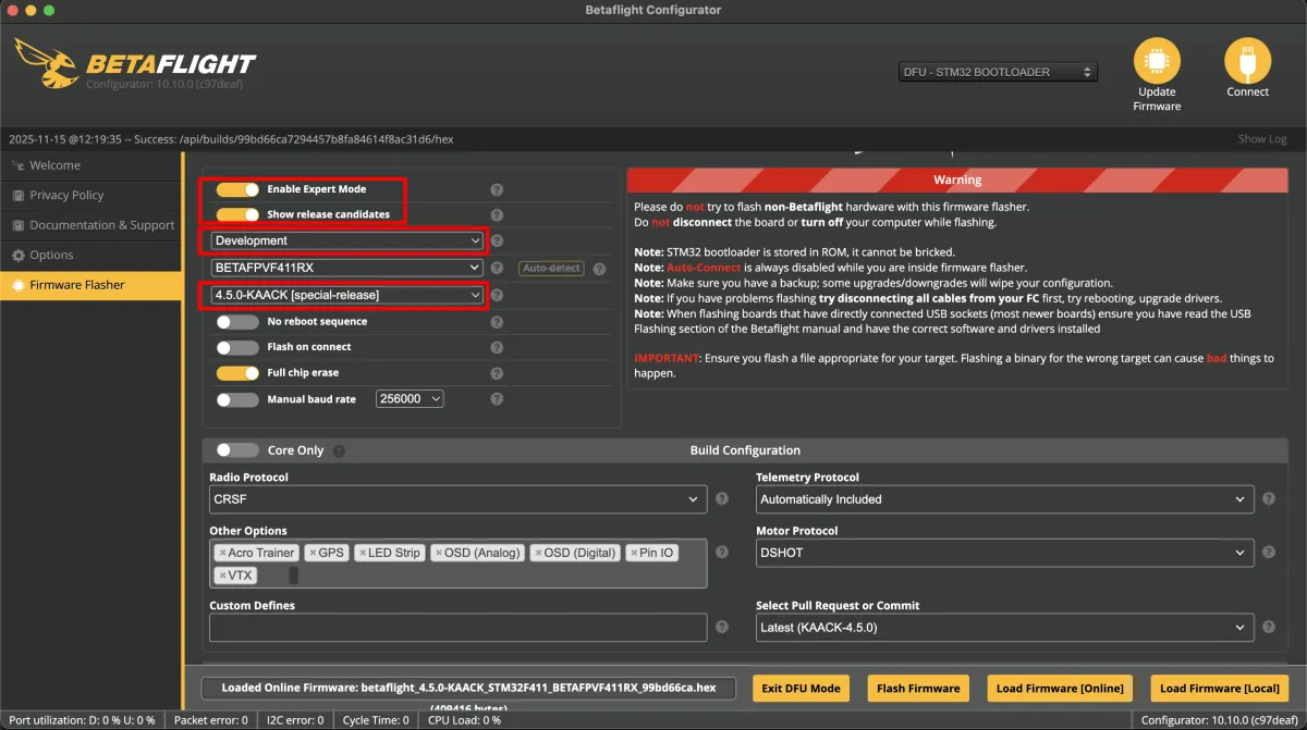 Flash the new hex. Use 4.5 Kaack Special Release. Start by putting your FC into Bootloader mode with the CLI command "BL". Then enable expert mode and show release candidates, select "Development", select your board target (It was "BETAFPVF411RX" for me. Yours will likely be different), and select 4.5 Kaack.